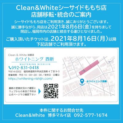 「Clean&Whiteシーサイドももち店」は2021年8月6日(金)を持ちまして閉店し、福岡市内の店舗と統合することとなりました。